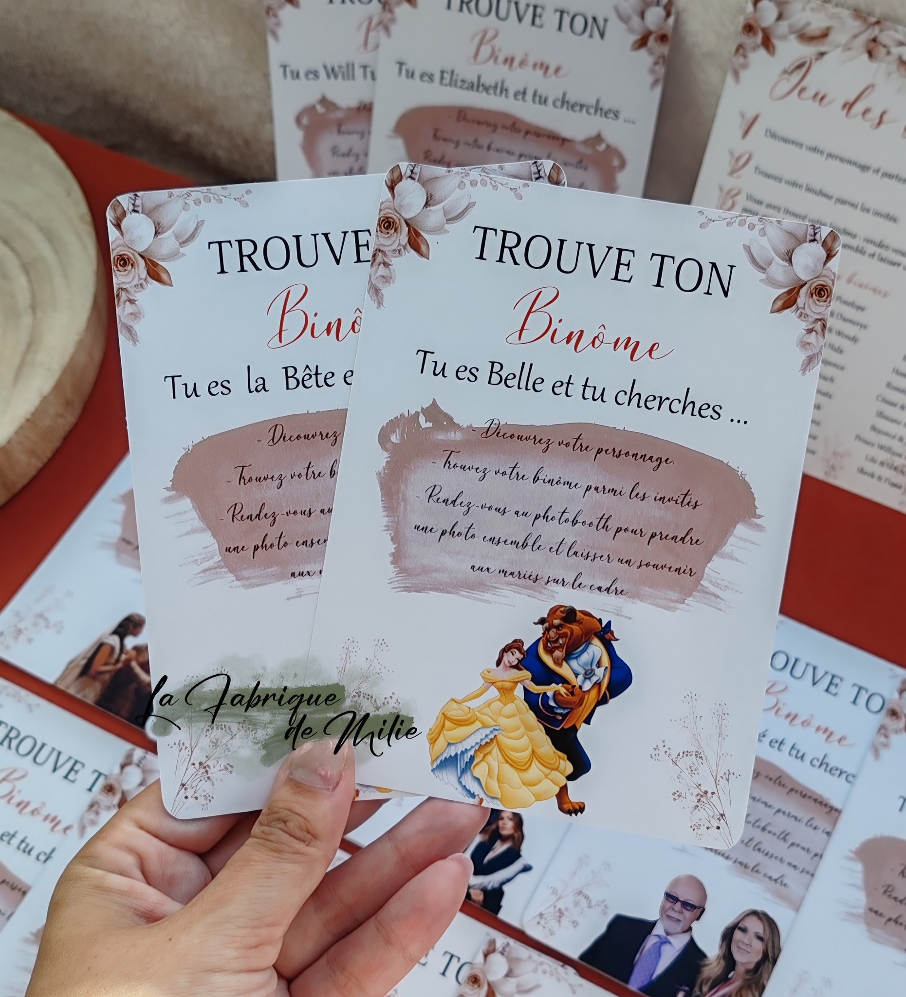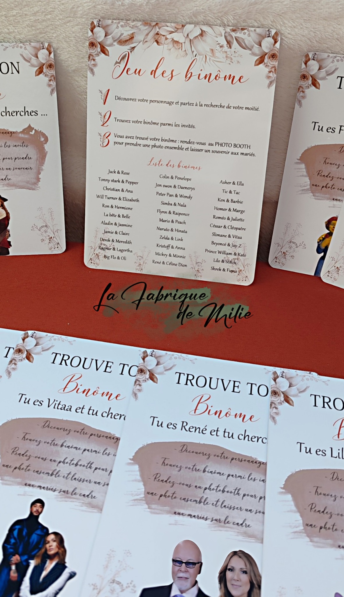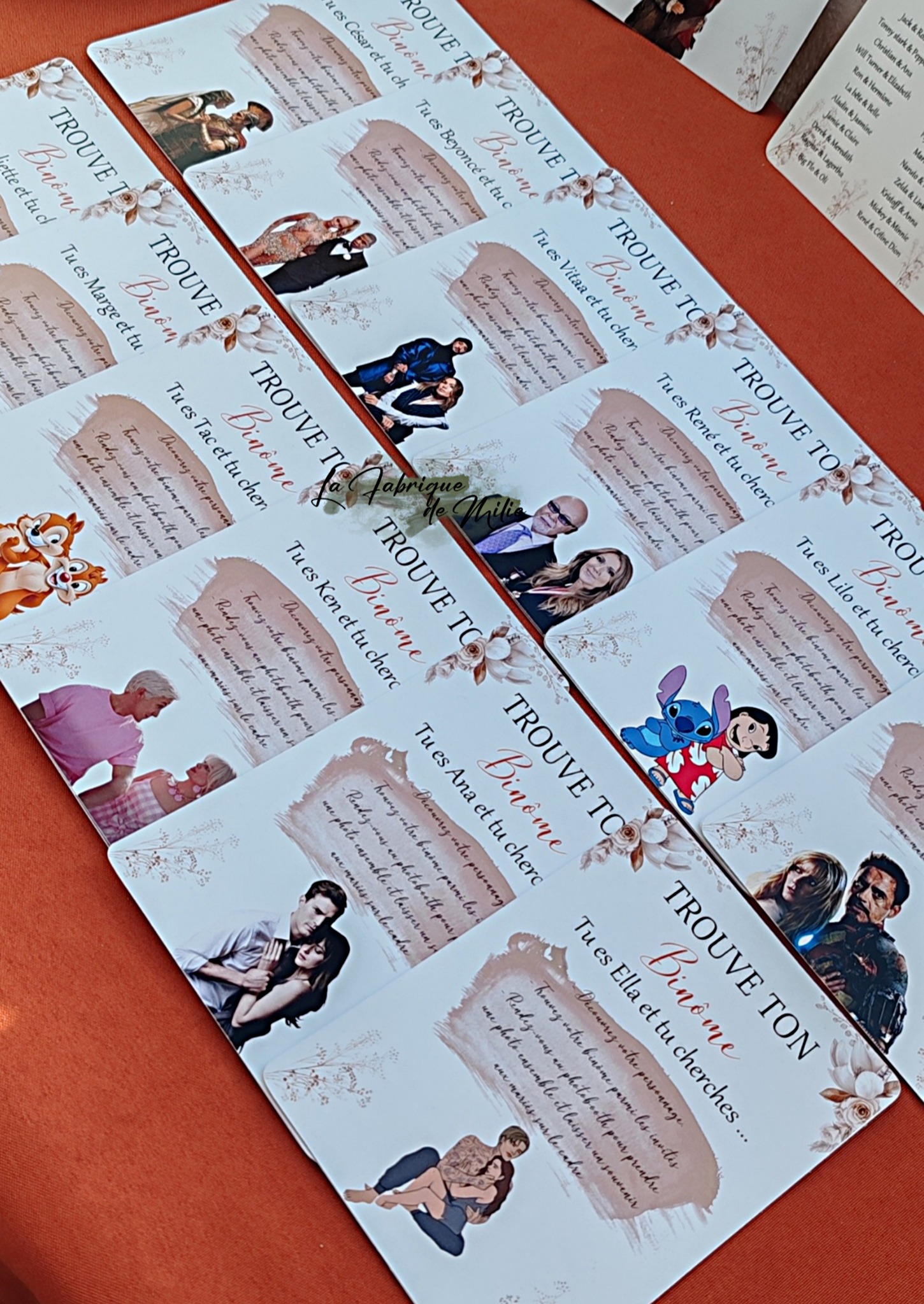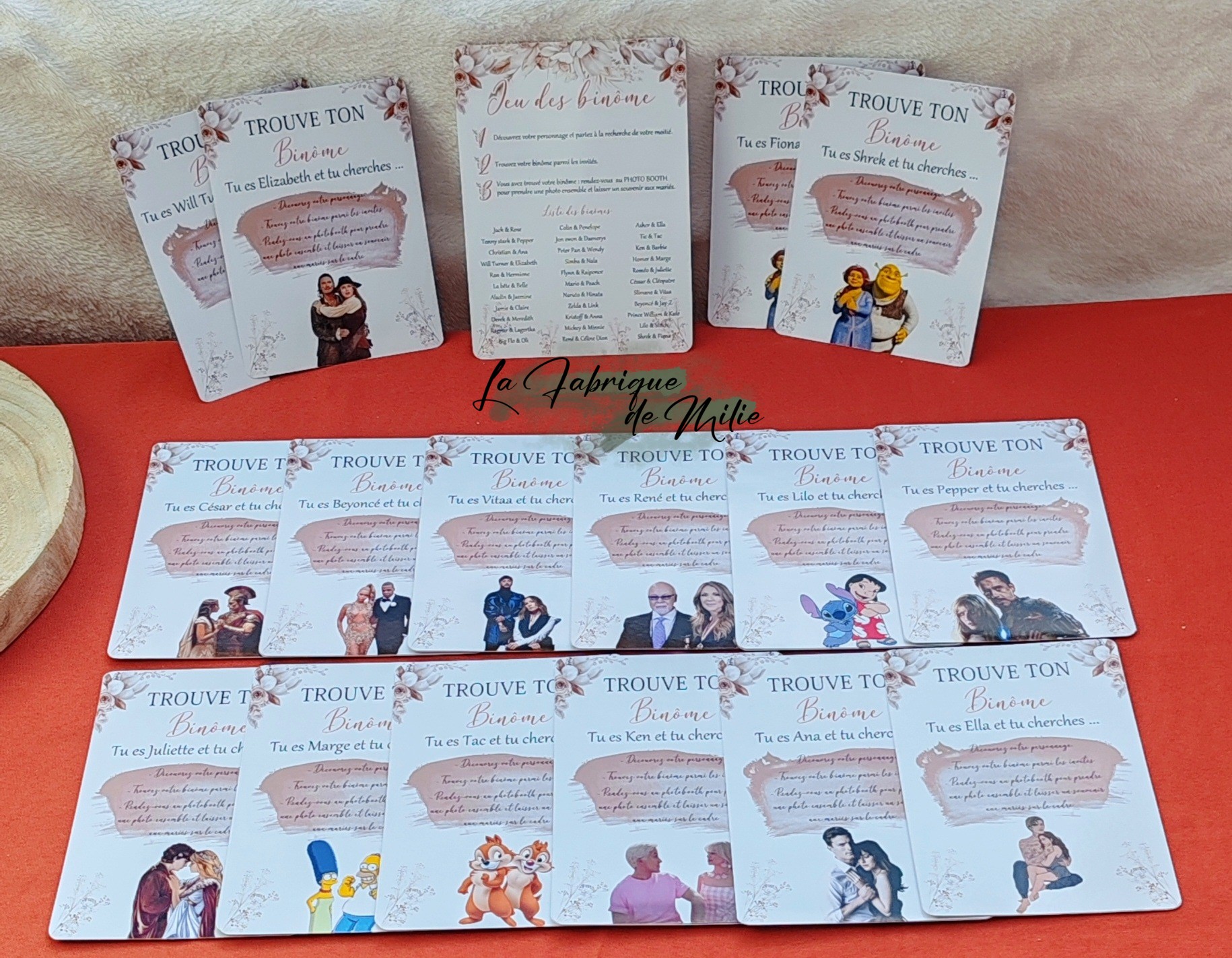 • 100% Personnalisable : Choisissez vos duos (couples célèbres, objets indissociables, ou même des anecdotes sur les mariés).